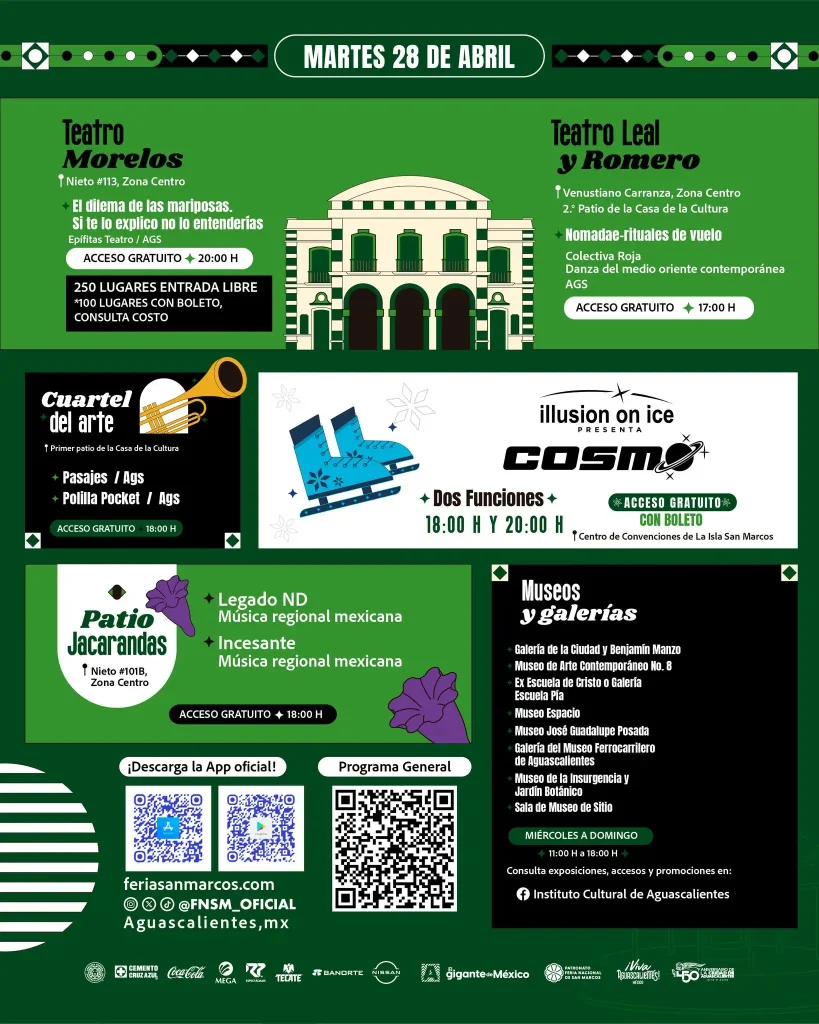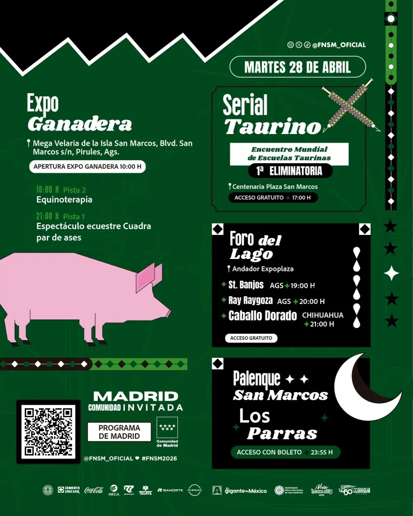 Además, la agenda del 28 de abril en la Feria Nacional de San Marcos 2026 ofrece opciones para visitantes de todas las edades dentro de uno de los eventos más importantes de México.