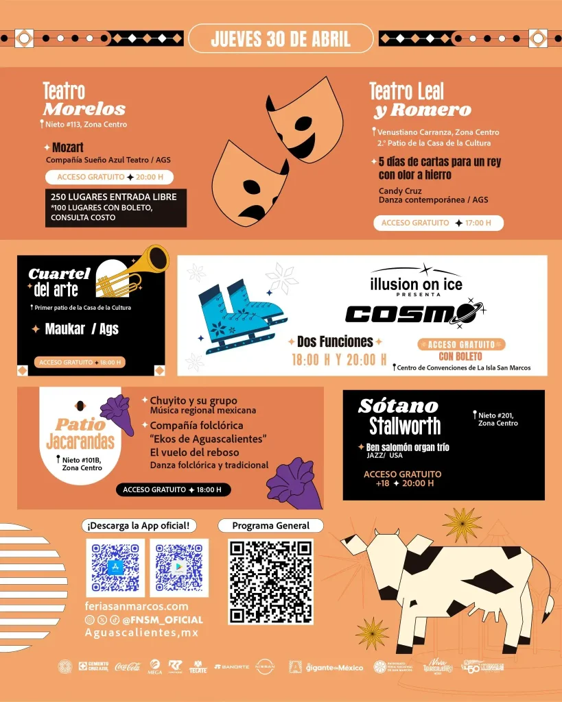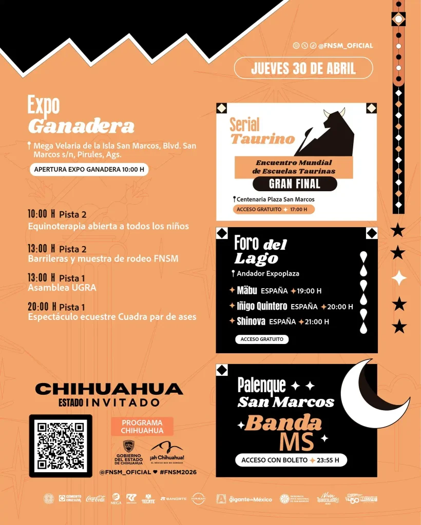 La Feria Nacional de San Marcos 2026 continúa con una de las jornadas más completas de su edición. Este jueves 30 de abril habrá conciertos internacionales, actividades culturales, Expo Ganadera, espectáculos familiares y una gran noche en el Palenque San Marcos.