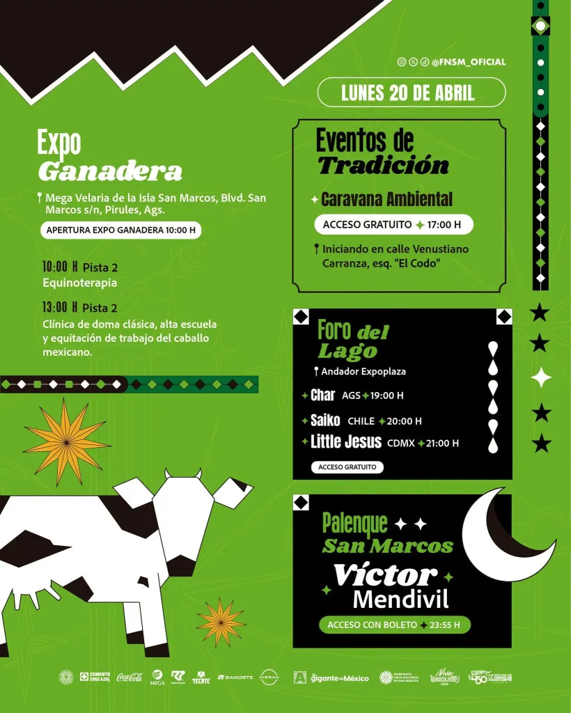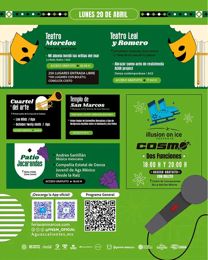 La Feria Nacional de San Marcos 2026 continúa con actividades para todos los gustos, y este lunes 20 de abril presenta una agenda llena de música, cultura, tradición, danza, teatro y entretenimiento familiar en distintos puntos de Aguascalientes.