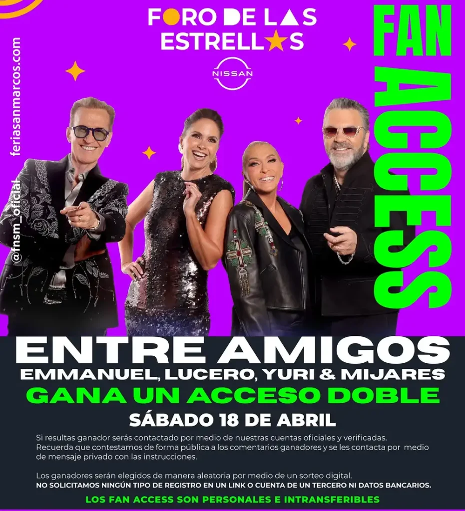 La Feria Nacional de San Marcos 2026 trae una de las presentaciones más esperadas del Foro de las Estrellas Nissan: Entre Amigos, con Emmanuel, Lucero, Yuri y Mijares. Y ahora puedes ganar un Fan Access doble para vivir este espectáculo desde una zona exclusiva el sábado 18 de abril.